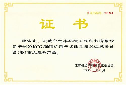 日前,蘭豐環保公司精心研制的KCG-300D礦用干式除塵器被江蘇省經濟和信息化委員會認定為江蘇省首臺(套)重大裝備及關鍵部件。