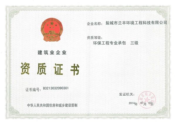 日前,接到鹽城市城鄉(xiāng)建設局通知,我司獲得了建筑業(yè)環(huán)保工程專業(yè)承包三級資質,標志著我司可承接億元以下工業(yè)項目的噪聲、有害氣體、粉塵、污水、工業(yè)廢料的綜合治理工程以及電力、工業(yè)鍋爐的脫硫、脫硝工程。