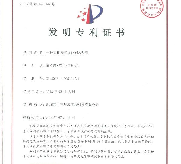 日前我司接到國家知識產權局通知,我司申報的《一種有機廢氣凈化回收裝置》獲得該局正式授權,這也是我司今年獲得的第三項發明專利授權,截止目前公司獲得了十多項發明專利和六十項實用新型專利。