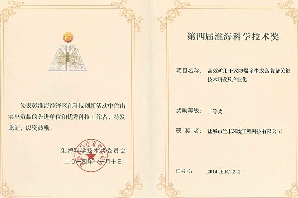 日前,由蘭豐環保公司精心研發的“高效礦用干式防爆除塵成套裝備關鍵技術研發及產業化”項目喜獲第四屆科學技術獎二等獎。