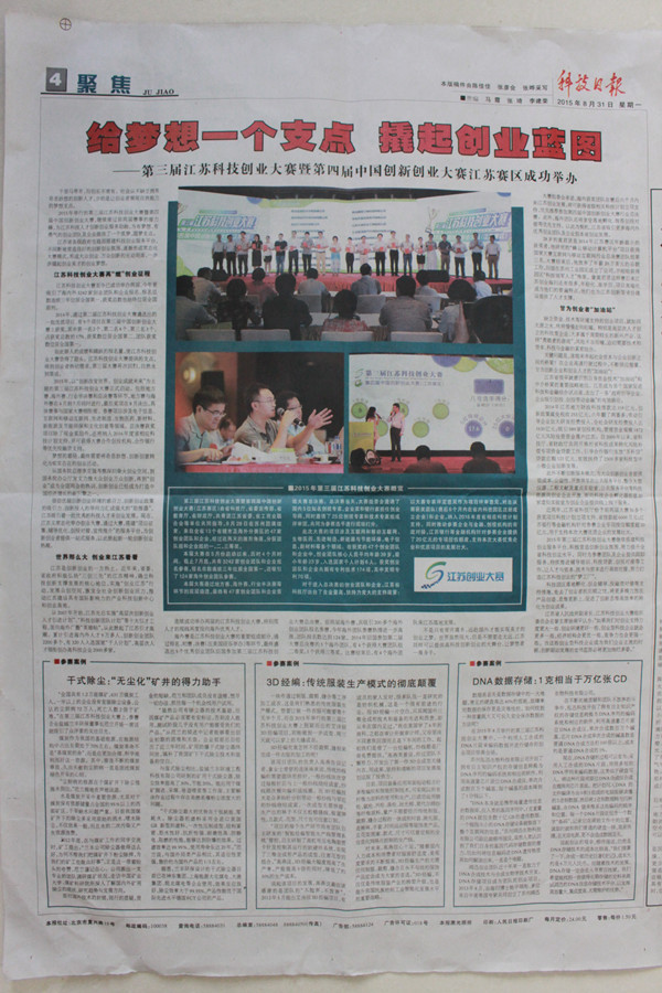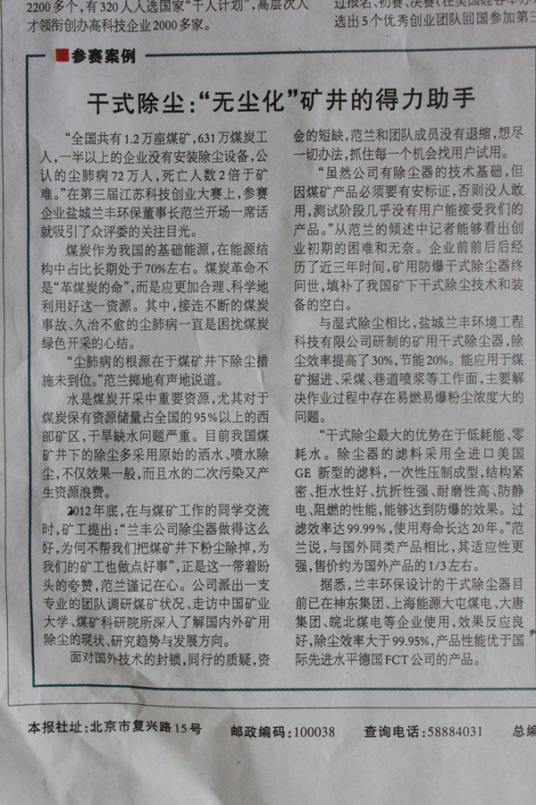 (本站訊)近日,科技日報刊登了《給夢想一個支點,翹起創業藍圖》的文章,詳細報道了由省科技廳、省委宣傳部、省教育廳、共青團江蘇省委、省工商業聯合會共同舉辦的“第三屆江蘇科技創業大賽暨第四屆中國創新創業大賽江蘇賽區”的賽況。來自全省13個省轄市及海外分賽區的47家創業團隊和企業,經過激烈角逐,分獲團隊和企業組一、二、三等獎。我司范蘭董事長憑借礦用干式除塵器項目,一路過關斬將,最終獲得本次大賽企業組三等獎。