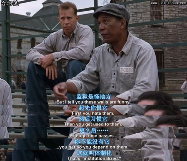 在這里,所有的囚犯無論吃飯、睡覺、上廁所都得報告,正如片中Red所說:“剛進入監(jiān)獄時,你痛恨周圍的高墻;慢慢地,你習慣了生活在其中;最終你會發(fā)現(xiàn)自己不得不依靠它生存。”長久的習慣在這里演化成可怕的悲劇,每天一成不變的生活磨蝕著他們對于未來的憧憬。沒有希望、沒有自由、沒有尊嚴,仿佛生命的價值在這里已經(jīng)消亡殆盡。
