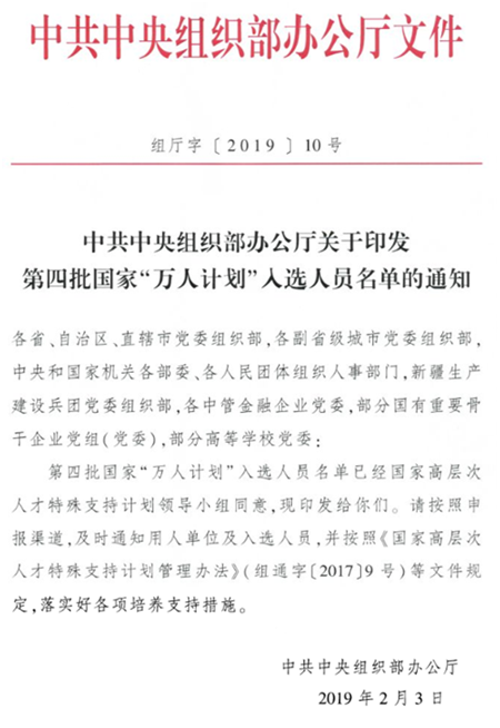 (本站訊)近日,中共中央組織部辦公廳下發《關于印發第四批國家“萬人計劃”入選人員名單的通知》,我司總經理范蘭入選“萬人計劃”科技創業領軍人才。