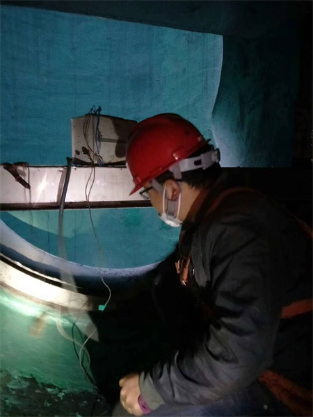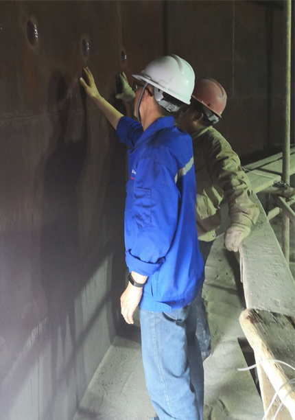 山東中興碳素煙氣凈化項目進入對接煙道階段,在53米高空項目經理包工用電火花檢查煙道防腐質量,為順利通煙氣做準備,推動項目早日完成。