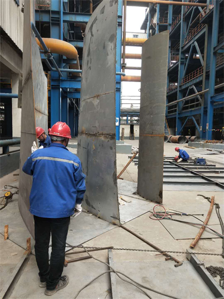 呂梁電改袋項目安裝現場,正在對出口煙道彎頭和導流板進行拼接,確保25天的施工工期可以順利投運。