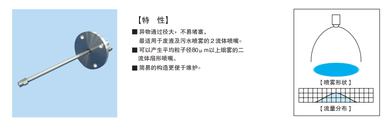 異物通過徑大,不易堵塞。最適用于廢液及污水噴霧的2流體噴嘴,可以產(chǎn)生平均粒子徑80um以上細霧的二流體扇形噴嘴。