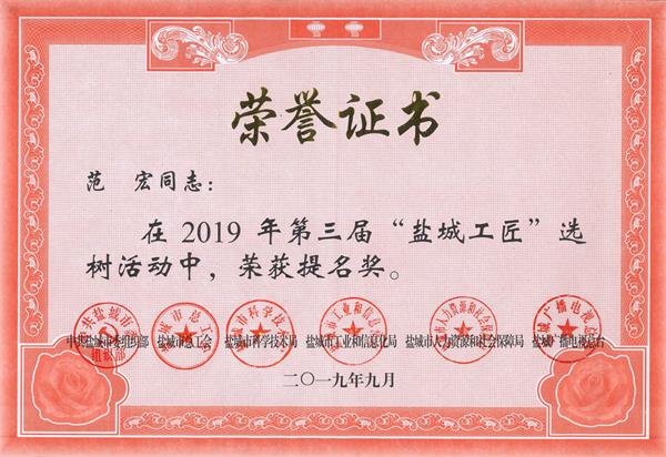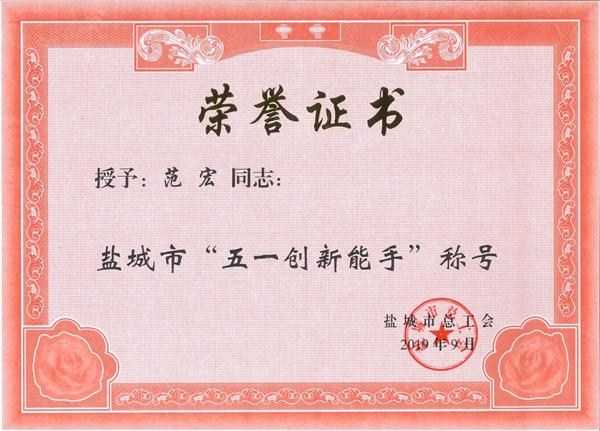 今年五月份,市委組織辦、市總工會、市科技局、市工業(yè)和信息化、市人力資源和保障局等聯(lián)合開展了“鹽城工匠”選樹活動,活動旨在進(jìn)一步提升職工的崗位責(zé)任感、職業(yè)榮譽(yù)感、企業(yè)歸屬感,加快建設(shè)一支宏大的知識型、技能型、創(chuàng)新型勞動者大軍,促進(jìn)我市制造業(yè)升級和高質(zhì)量發(fā)展。經(jīng)過推薦、審核、評審、投票、公示,我司范宏榮獲第三屆“鹽城工匠”提名獎、“鹽城市五一創(chuàng)新能手”。
