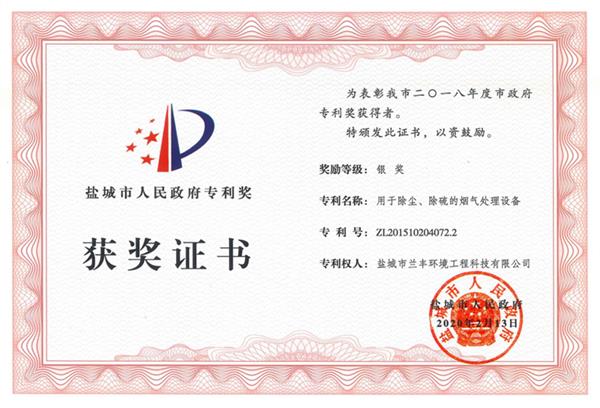 2016年底,我司通過知識產權管理體系貫標,貫標以來,我司持續落實管理規范,健全管理機制,規范生產經營各個環節的知識產權管理。專利數量和質量持續提升,創新能力持續增強,2017年,獲得鹽城市工業企業專利十強,2018年獲得國家知識產權優勢企業,2019年獲得市爭星創優科技創新企業,2020年獲得市知識產權貫標優秀企業。同時,我司發明專利“用于除塵、除硫的煙氣處理設備”獲得鹽城市人民政府專利獎銀獎。