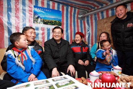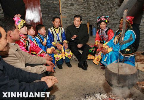 12月27日,中共中央總書記、國家主席、中央軍委主席胡錦濤在四川省綿陽市平武縣平通鎮(zhèn)牛飛村考察,同羌族村民們圍坐在火塘邊親切拉家常,了解他們?yōu)暮笊a(chǎn)生活情況。 新華社記者鞠鵬攝