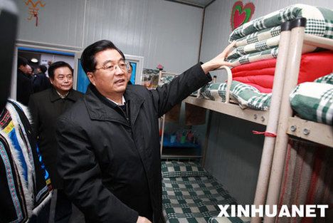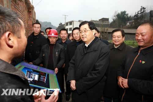 12月27日,胡錦濤在綿陽市平武縣平通鎮(zhèn)牛飛村了解受災(zāi)群眾住房重建以及安全過冬情況。新華社記者鞠鵬攝