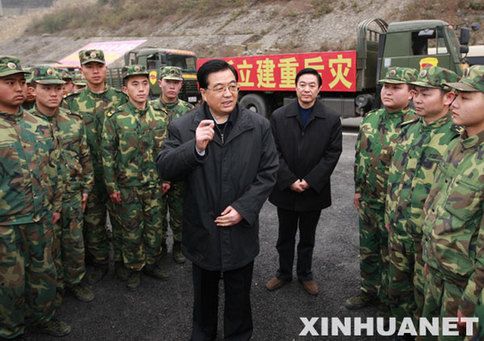 12月27日至29日,中共中央總書記、國家主席、中央軍委主席胡錦濤來到四川地震災(zāi)區(qū),深入重建工地、企業(yè)車間、農(nóng)村村寨、受災(zāi)群眾集中安置點(diǎn)和學(xué)校、衛(wèi)生院,實地了解災(zāi)后恢復(fù)重建和群眾生產(chǎn)生活情況,看望慰問災(zāi)區(qū)干部群眾和各地援建人員,代表黨中央向大家致以親切的問候和新年的祝福。