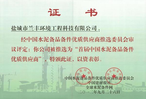 日前接到中國建材報社通知,由該報社、中國水泥備品備件優質供應商推選委員會共同組織全國多位知名專家,重點圍繞參評企業的信譽、規模、業績以及創新能力等四個方面進行了認真的評審,我司當選首屆“中國水泥備品備件優質供應商”稱號,這是我司繼八月下旬獲得中國“十二五”水泥裝備行業最具影響力企業后的又一榮譽稱號。這標志著“蘭豐” 品牌在國內建材行業已得到廣泛認可。